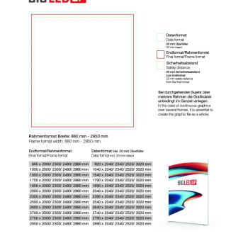 The BIG LEDUP® stele uses precision-engineered, silver-anodised aluminium profiles with a depth of 12 cm, creating a modern, slim appearance that integrates seamlessly into a wide variety of environments. The profiles fit together perfectly to form a stable frame. High-quality fabric silicone edge graphics (SEG) are easy to attach, simple to handle, and can be replaced independently at any time.