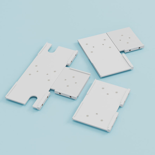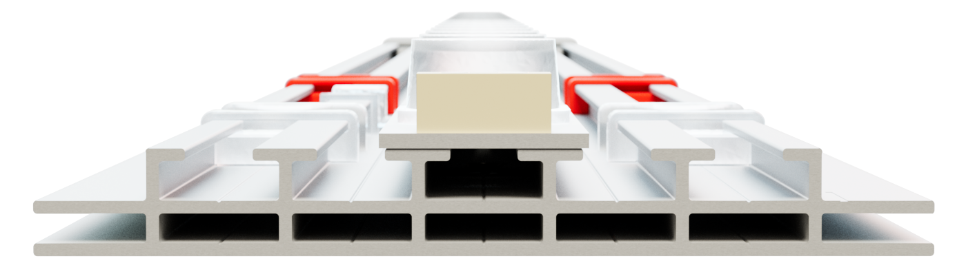 Power is transmitted via an integrated pogo-pin connection, eliminating the need for external cables inside the frame. As soon as the frame elements are connected, the power supply is established automatically – clean, safe, and reliable