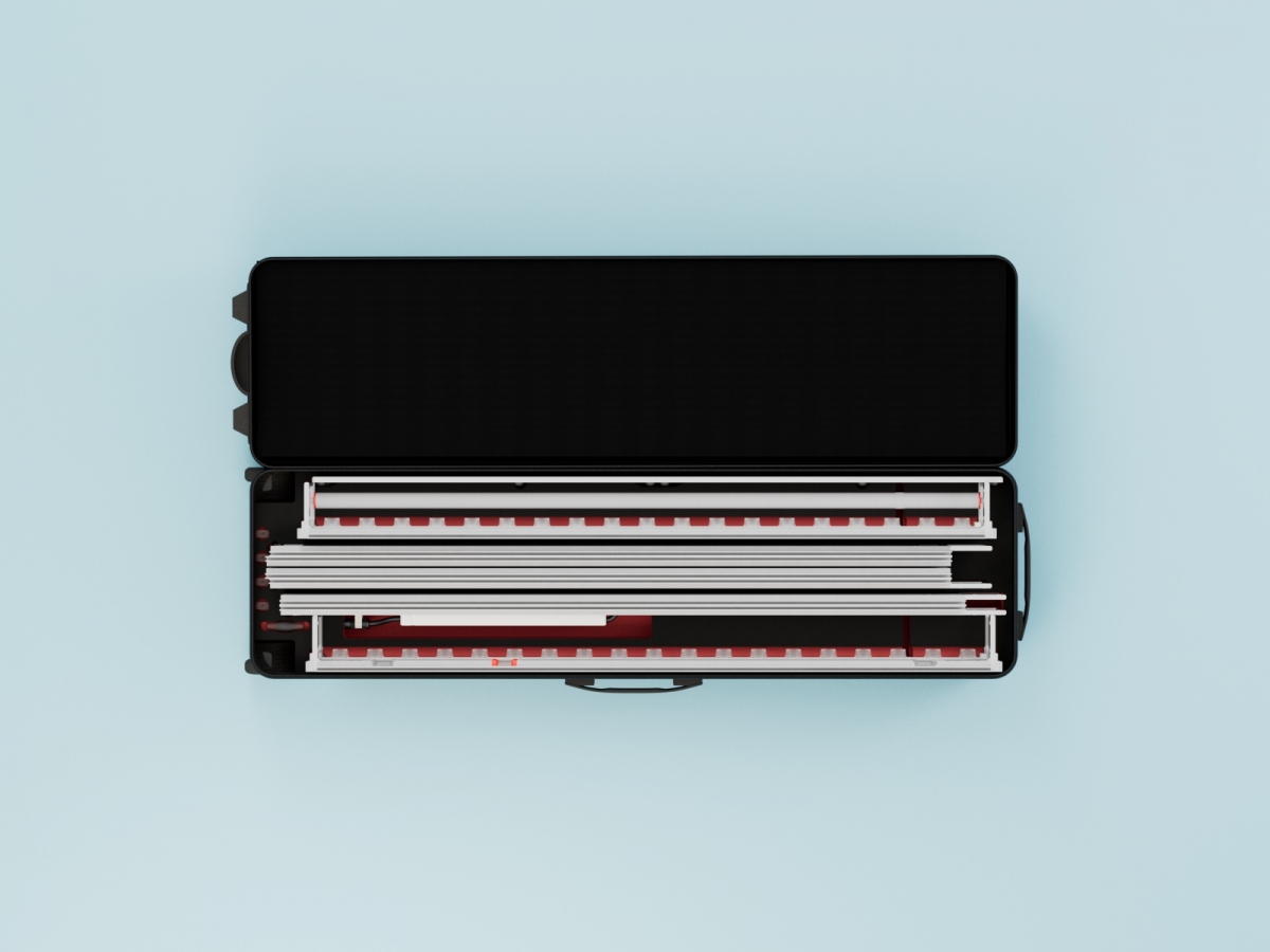 With a compact length of just 120 cm, the case fits easily into any standard car. At the same time, its dimensions correspond to a Euro pallet, making it suitable for palletised shipping by freight carrier. This ensures the entire system remains mobile, flexible, and versatile at all times.