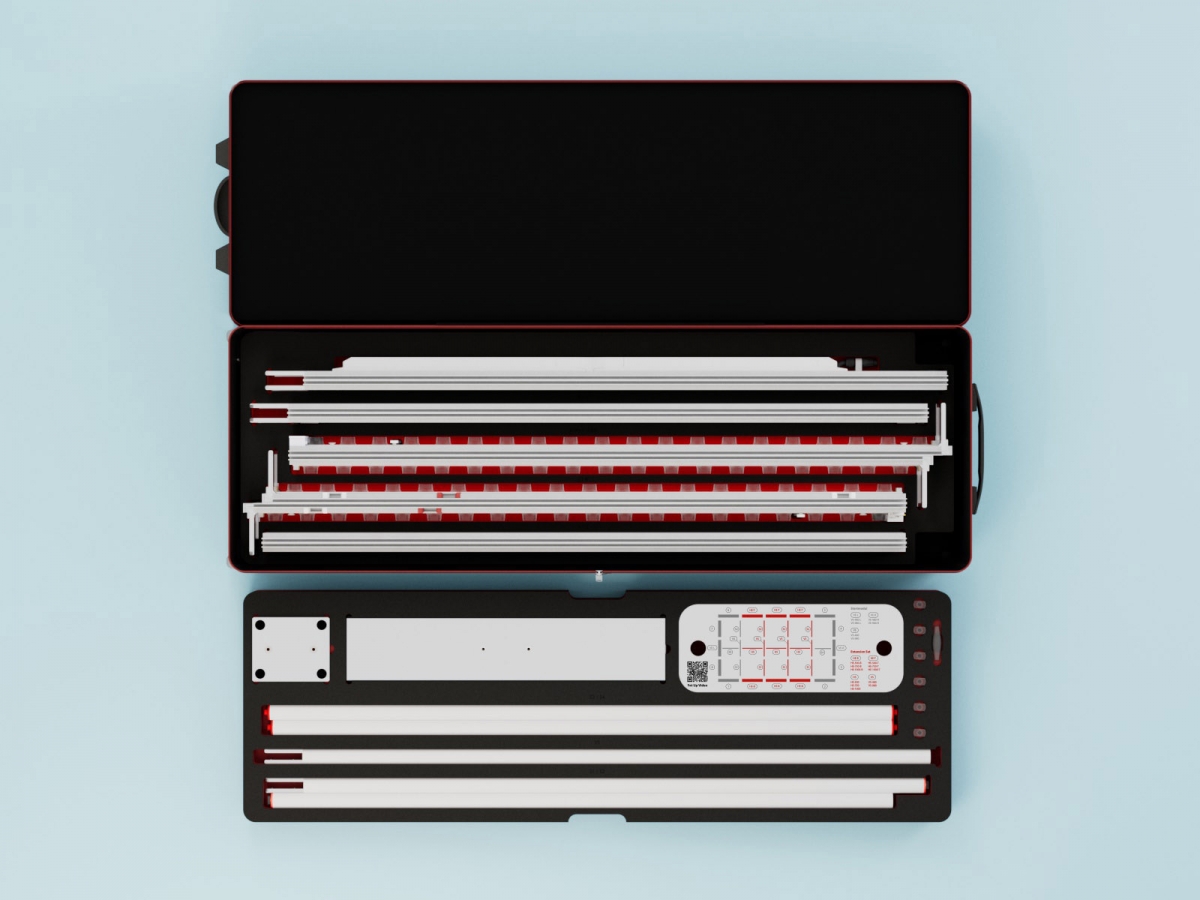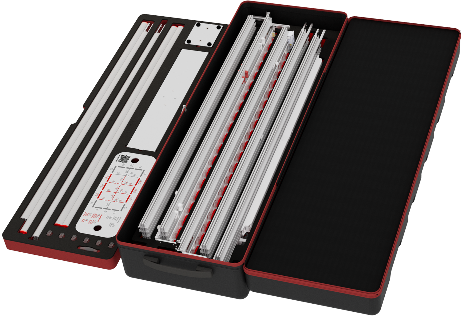 Every part is clearly labeled so that its designated place in the hard-shell case can be easily found. Precisely cut foam inserts with matching recesses protect all system components inside the case from transport damage.