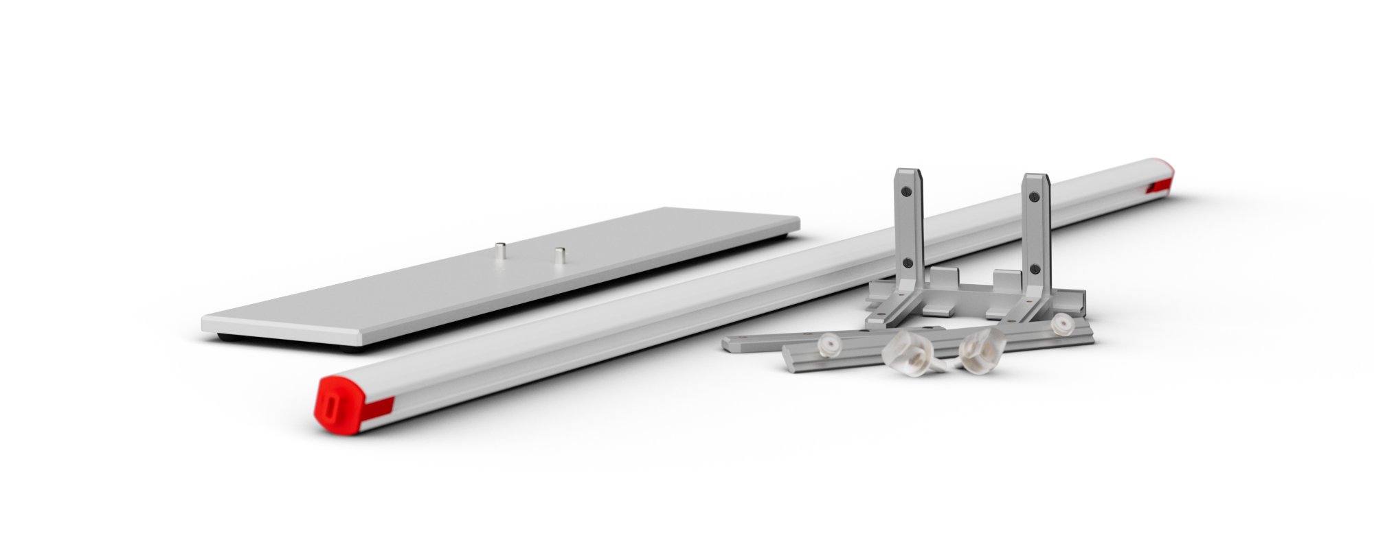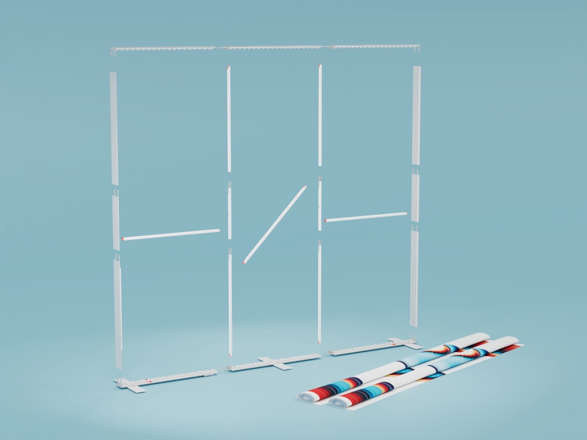 Simply remove the individual components from the handy ABS travel case, assemble them (no tools needed), screw on the feet – and you’re ready to go! Digital prints with sewn silicone welts around the edges can be easily attached to the system, are user-friendly in handling and can be changed independently any time.