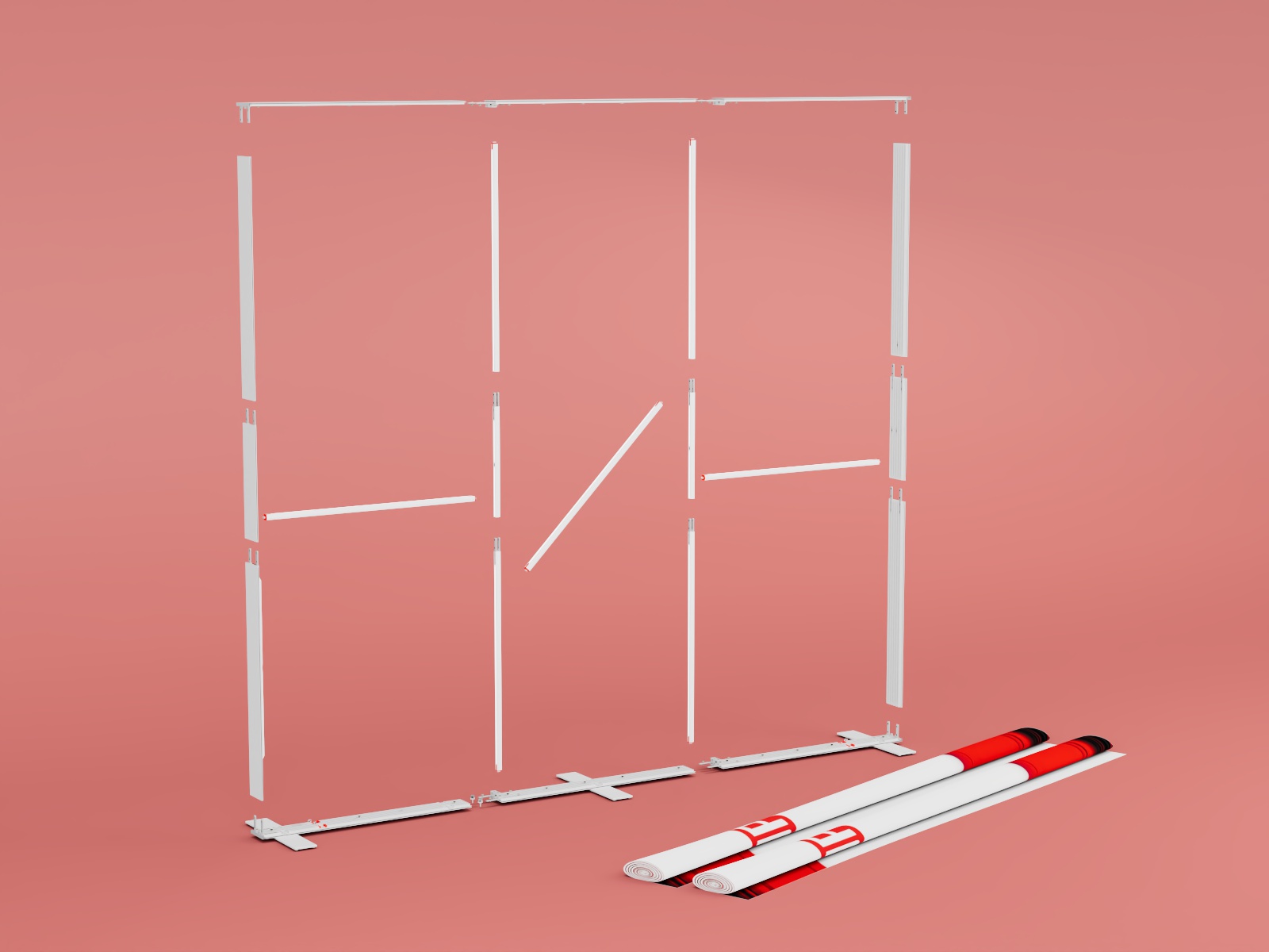 Simply remove the individual components from the handy ABS travel case, assemble them (no tools needed), screw on the feet – and you’re ready to go! Digital prints with sewn silicone welts around the edges can be easily attached to the system, are user-friendly in handling and can be changed independently any time.