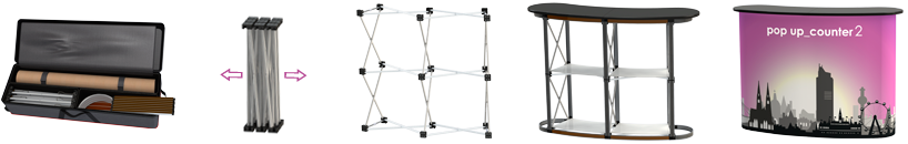 The folding counter pop up_counter is easy to set up and locks with magnets. A light weight counter for your exhibiton.