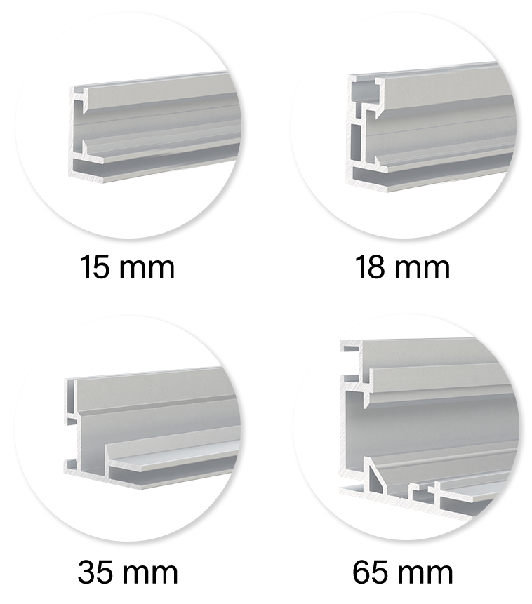 Multi frame profiles are available in different depths / widths 15, 18, 35, 65 mm