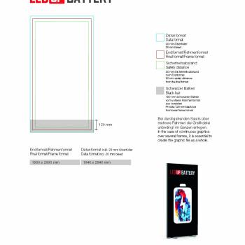 The LEDUP® Battery is a double-sided illuminated display in a frame format of 100x200cm, which is mainly used in places where there is no power plug or where cables cannot be laid for other reasons or where it is undesirable. The interior lighting from 2 sides is carried out using the latest pogo pin lighting technology and highly efficient LED modules. The main technical informations to be mentioned here are 50 watts of system output, 12,600 lm and a color temperature of 6,500 Kelvin.