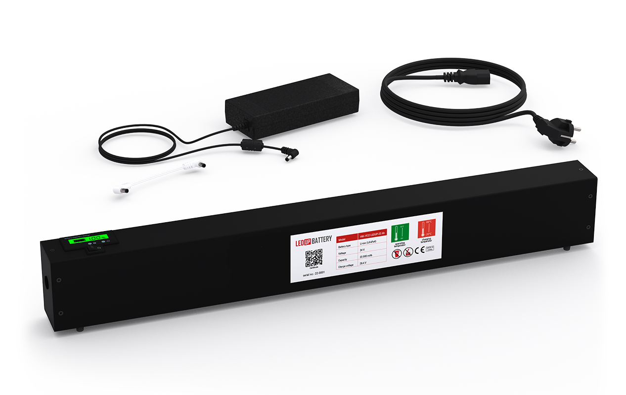 The rechargeable 24 volt lithium-ion powerpack has a weight of 5 kg with an output of 22,000mAh and can illuminate the LEDUP Battery for over 10 hours. This gives you the opportunity to illuminate the LEDUP Battery for an entire day at a fair. If you do have the opportunity to find a power connection near the light frame, you can operate the light frame directly from the power supply in just a few simple steps.