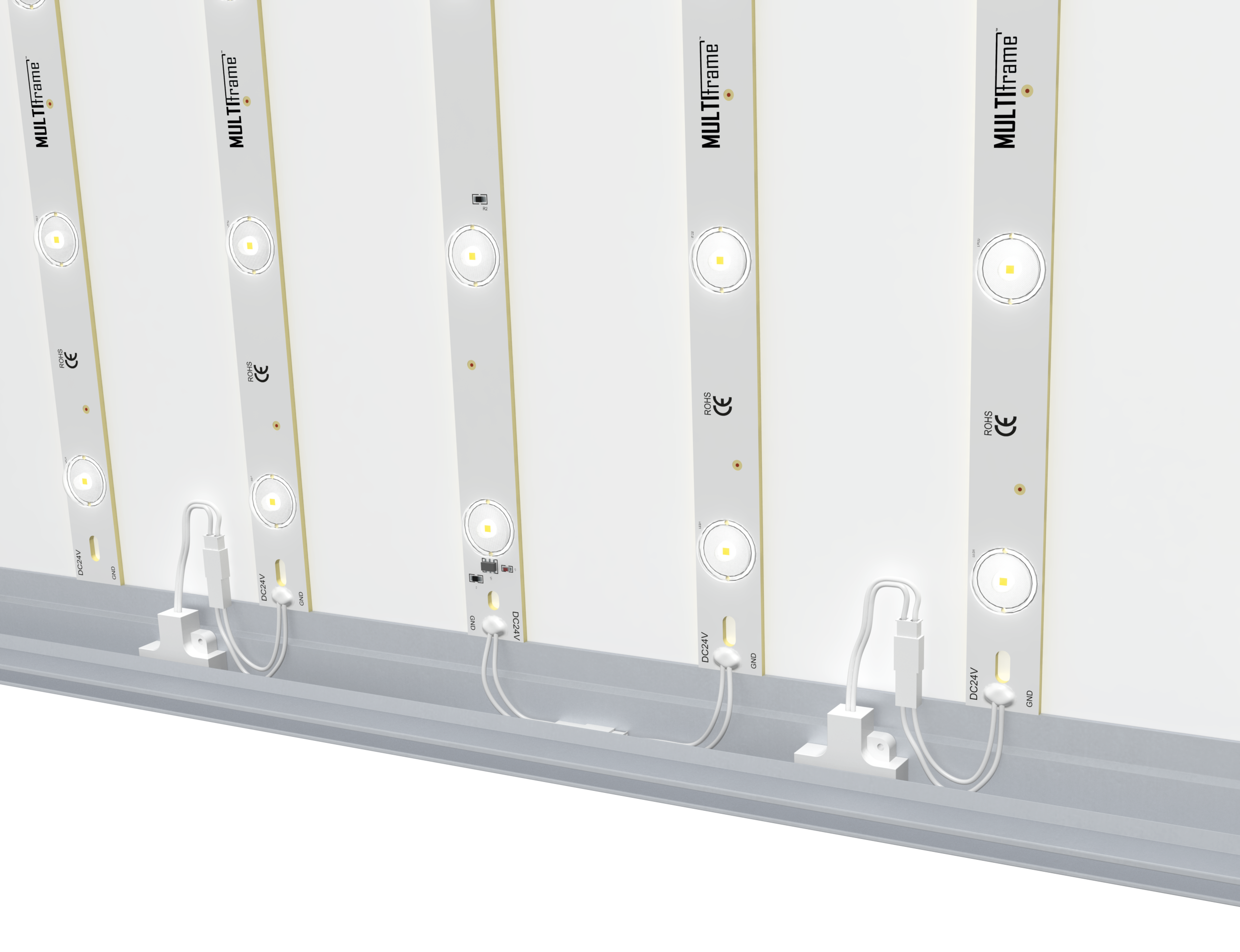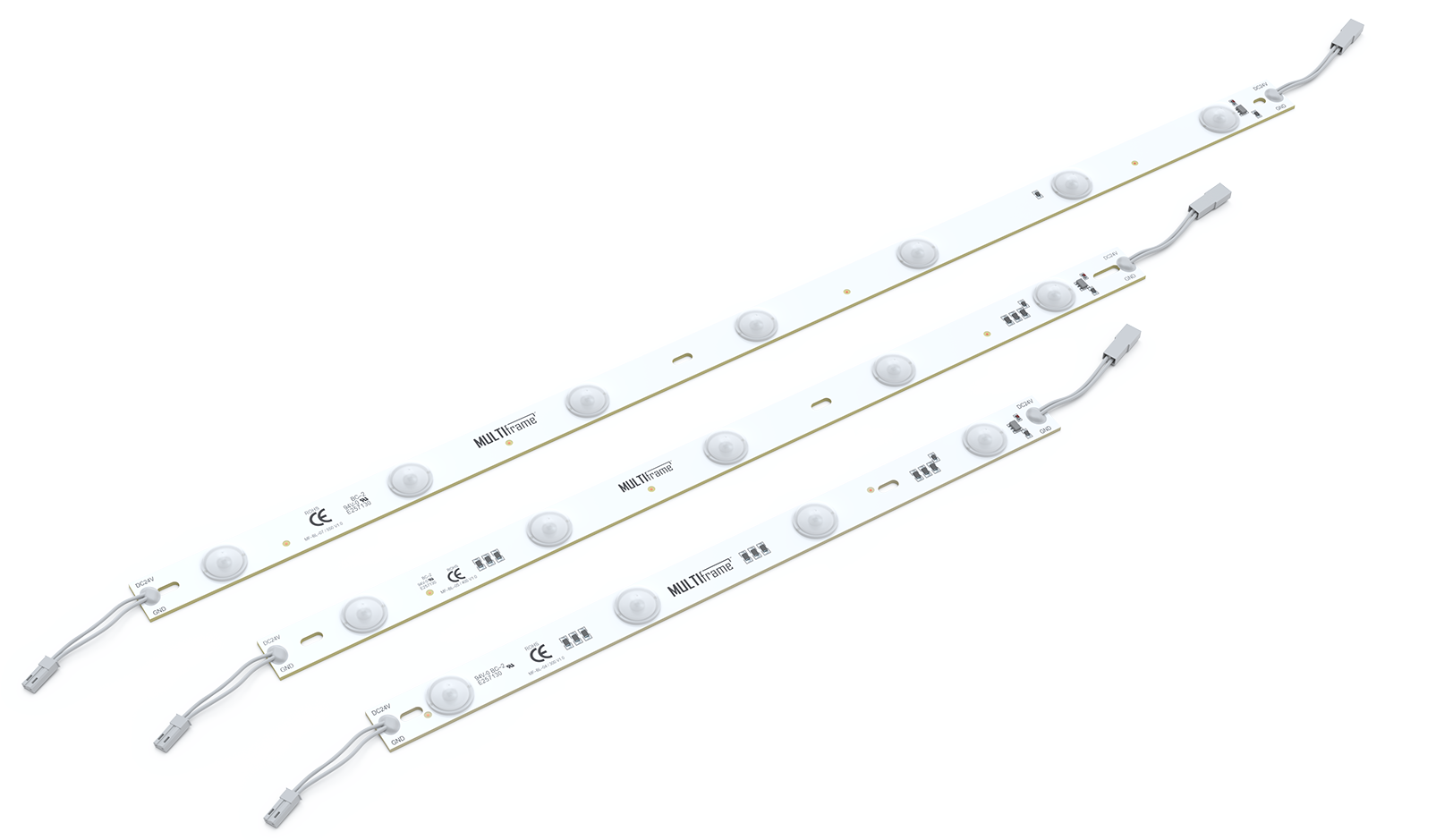 Using high quality OSRAM LED technology in combination with a perfectly adjusted lens the following results can be achieved:  approx. 7000 lm, approx. 45 watt/m2, approx. 1600 cd and colour temperature 6000 Kelvin. Above data show that multi frame Super Slim 35 / 65 frames which are primarily used to backlit pictures can also be used just for lighting too.The modular design of the LED modules allow us to back light almost any frame size with an even, bright light with no hot spots.