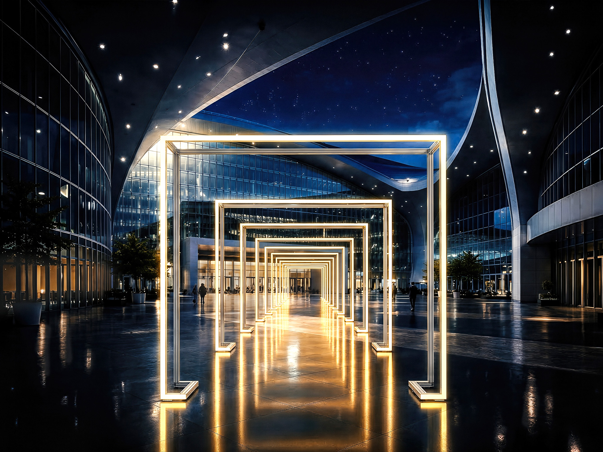 Ideal for entrances, transitions, and connected booth architectures. For presentations defined by structure, clarity, and maximum flexibility.
