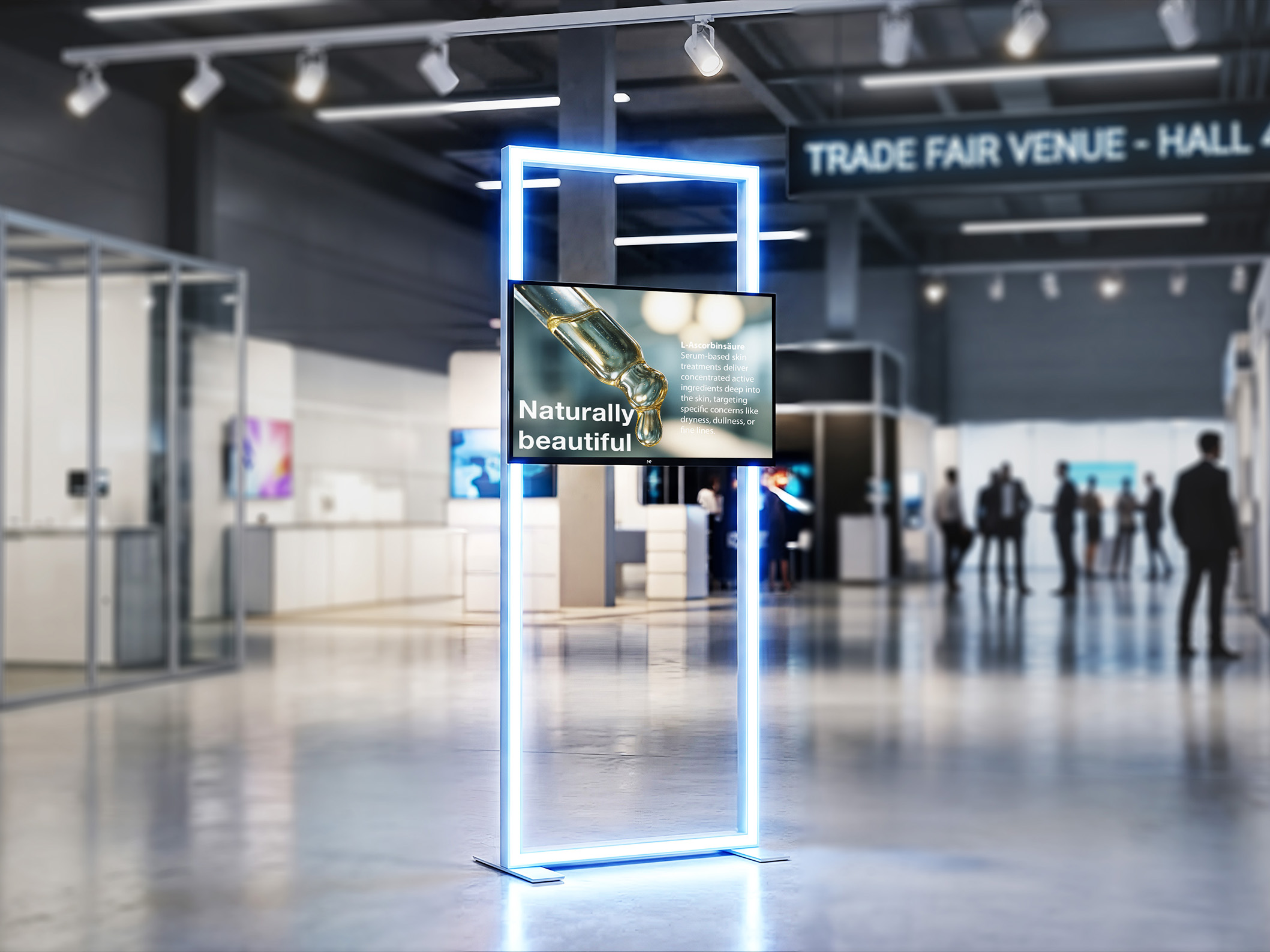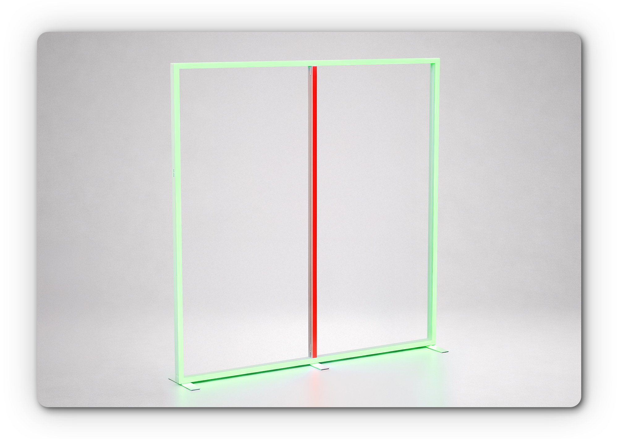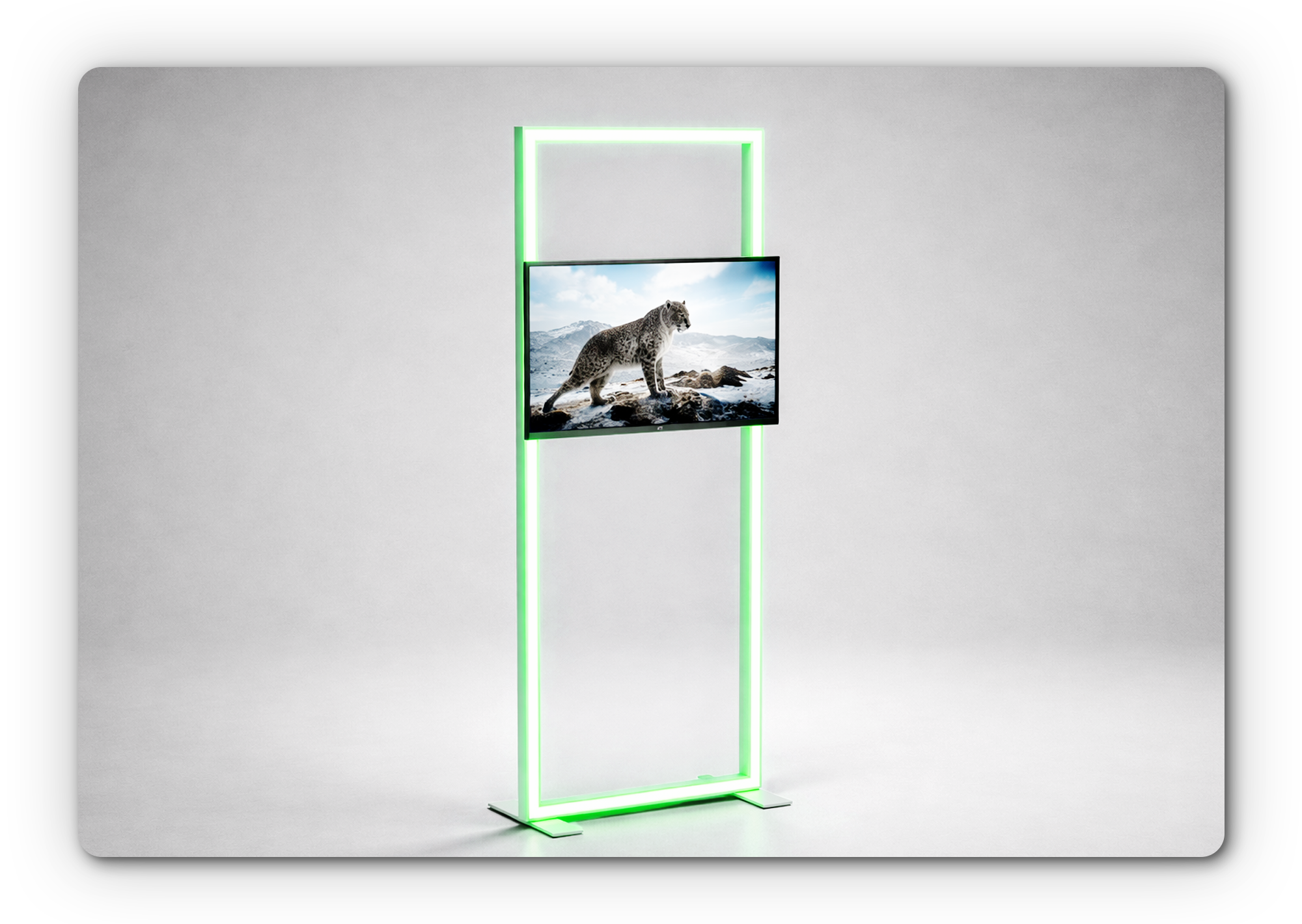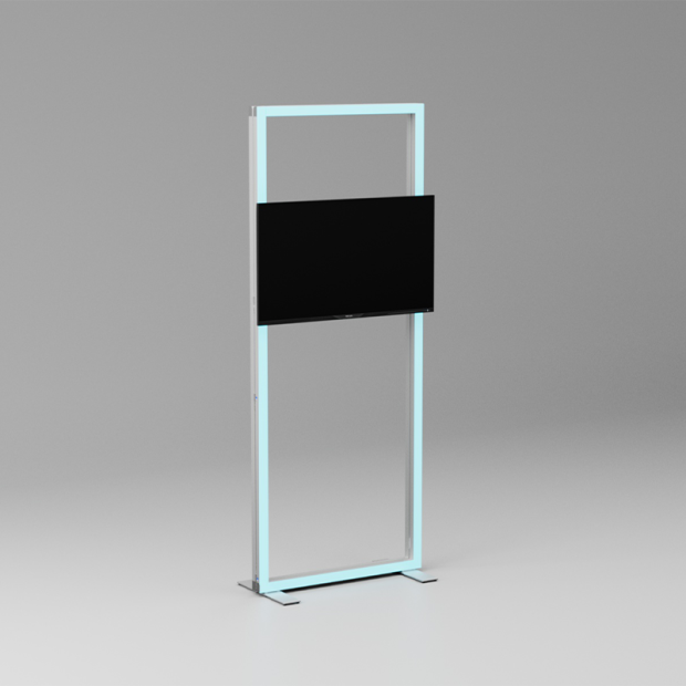 Crafted from aluminum profiles and equipped with RGB-LED light strips capable of displaying up to 16 million colors, it creates a visual presence tailored precisely to your presentation.