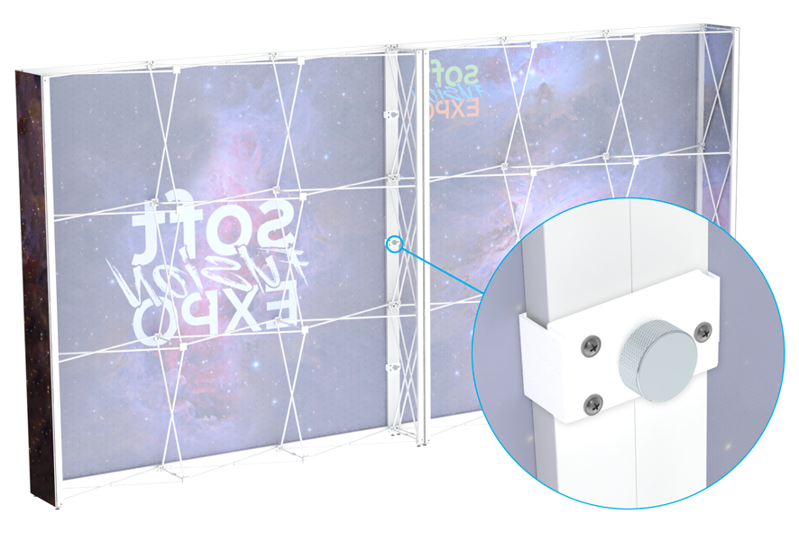 The pop up soft expo fusion is a folding system (pop up) for fabric tensioning with silicon lips. With most fabric tension systems the fabric print is already attached to the system.