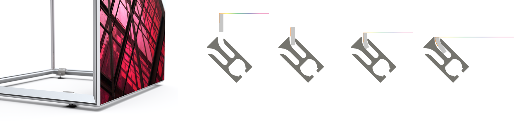 The advantage compared to similar products is the 90° profile slot. The fabric is pushed 3 mm into the slot and only then tensioned around the corner. This technique helps to preserve the fabric as it prevents it from overstretching.